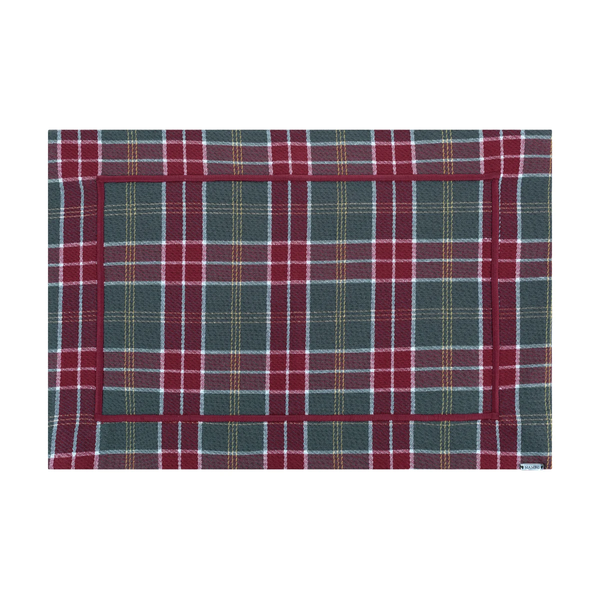 Jogo americano em tecido jacquard vermelho com estampa xadrez da Mameg, com bordado no contorno da peça.