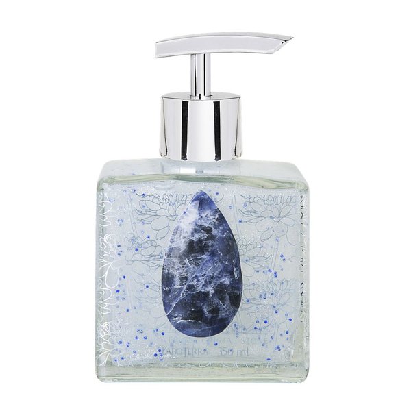 Sabonete líquido em embalagem de vidro, decorado com pedra natural na cor azul (sodalita) e acabamento prateado, da marca Laboterra. O charme da embalagem se dá pelas pedras naturais únicas, que variam nas suas tonalidades e formatos.