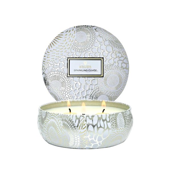 Vela perfumada da marca Voluspa, em embalagem de metal com tampa.